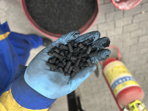 在進行擠壓成型前,膨潤土和木質生物炭粉混合的同時要添加一定比例的水,只有在濕潤的狀態下,膨潤土的粘結性才能夠充分體現出來。否則擠壓出來的成品容易破碎。